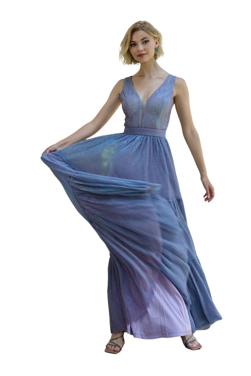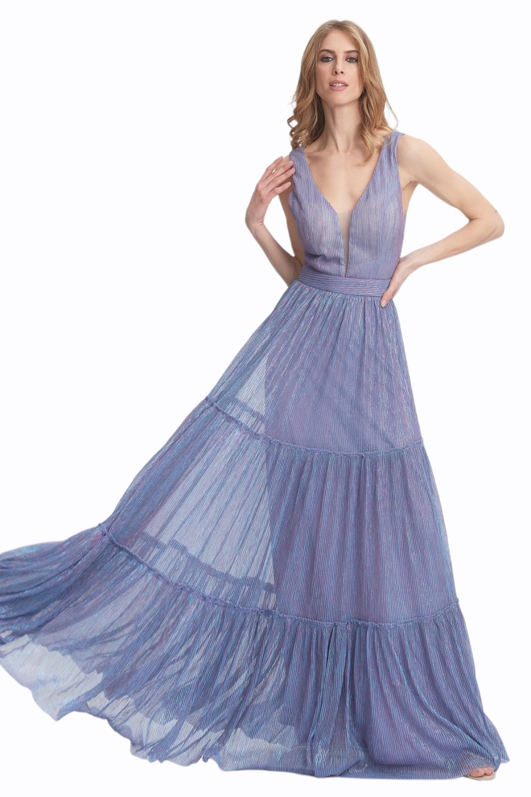 Maxi Φόρεμα σε άνετη γραμμή από ανάλαφρο χυτό ύφασμα με μεταλλική όψη και πολύ πυκνό πλισέ effect. To μπούστο αγκαλιάζει άψογα το κορμί και είναι ανοιχτό σε σχήμα V, όπως ακριβώς και η πλάτη είναι. Η μέση είναι στενή και κάτω από αυτήν ανοίγει η φούστα η οποία διακοσμείται με δύο οριζόντιες εξωτερικές ραφές.